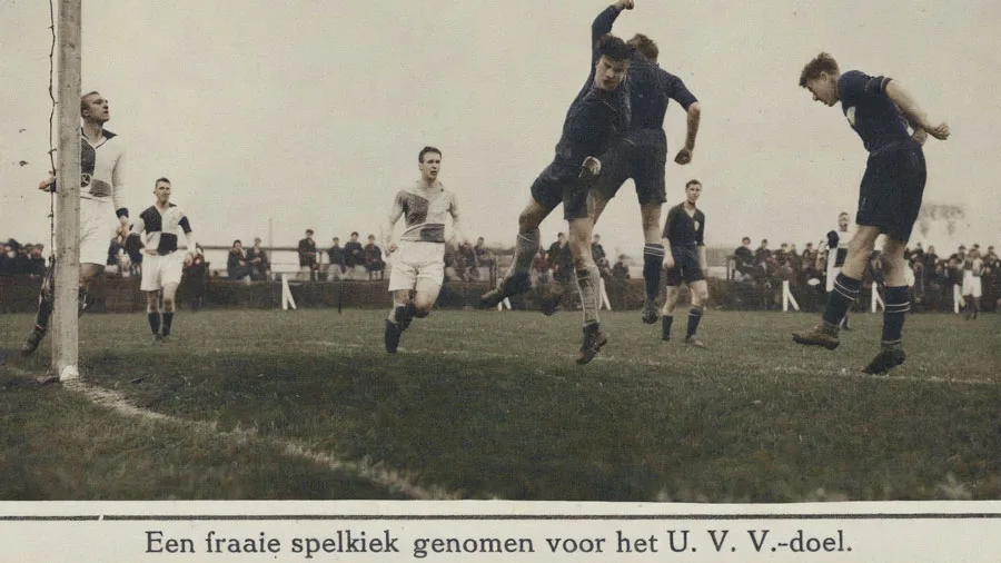 Foto boven: Spelmoment uit een voetbalwedstrijd U.V.V. aan de Lage Weide te Utrecht