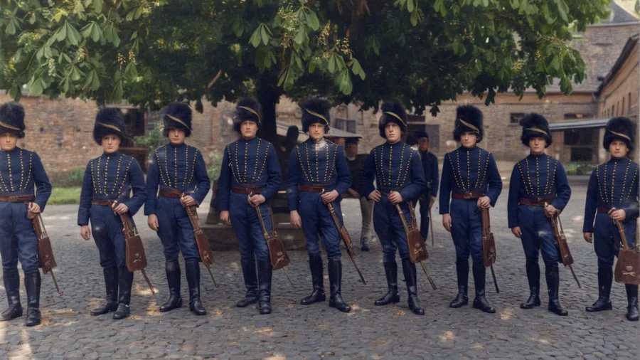 “Arnhem, uitstappen heren! Netjes lopen heren, je krijgt hier eten en drinken, over ’n klein uurtje gaan wij verder. Ze stappen de kazerne binnen. Moet je die gele kragen eens bekijken… “