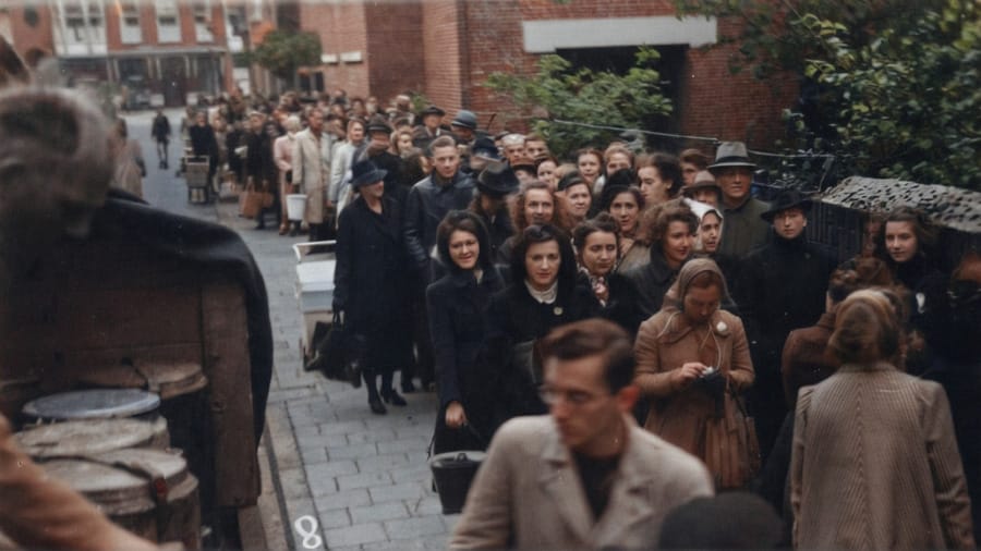 Het voedsel werd in de hongerende gebieden zo alsmaar schaarser en slechter. Winkels gingen suikerbieten en tulpenbollen verkopen ter vervanging van aardappels. In vrieskou moeten mensen wachten voor een kop waterige soep uit de gaarkeukens. Vrouwen staan er meestal alleen voor, hun mannen werken verplicht in Duitsland of zijn ondergedoken. Met name in het westen van Nederland werd tijdens het laatste oorlogsjaar grote honger geleden. Naar schatting 20.000 mensen kwamen om door honger en kou.