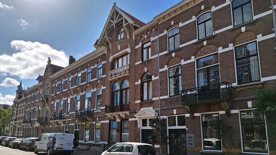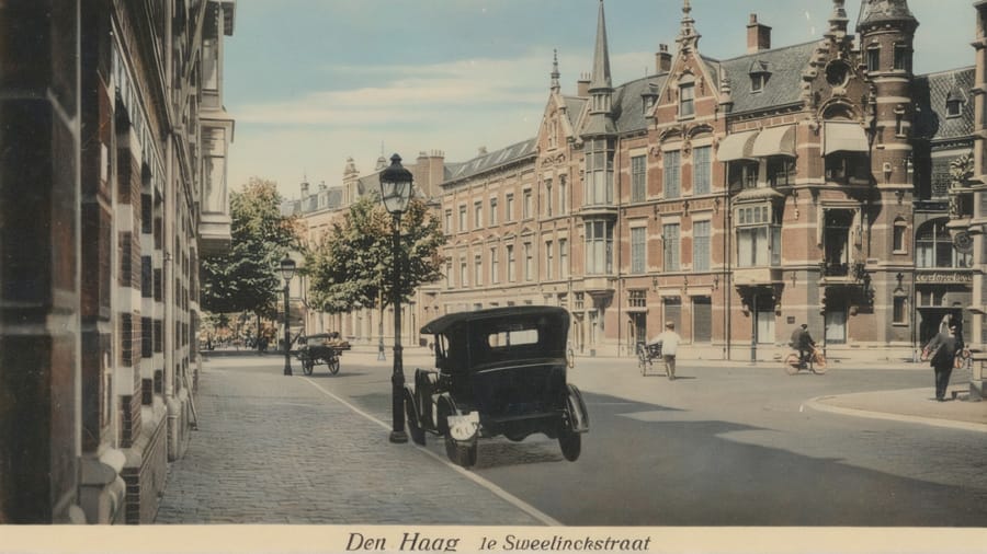 Foto: ansichtkaart 1e Sweelinckstraat, ter hoogte van de Banstraat (rechts) gezien naar het Sweelinckplein