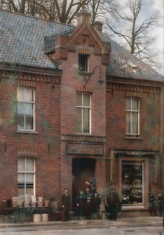 Dit pand werd in 1897 gebouwd in Jugendstil-stijl en gepacht door Frans Bernards en Hanne Derksen. Na het overlijden van Frans hertrouwde Hanne met Gerrit Schuurman, een man met een zeer sierlijke snor. Naar hem is het café genoemd. Hanne en Gerrit kochten vervolgens het pand van het Sint Antoniusgilde. In die tijd was in het voorgedeelte een café met aan de rechterzijde een bazaar het achterste gedeelte was een concertzaal/danszaal, (door Bernard in Jeus van Moeder Crisje deel 1, de grote zaal genoemd- zie citaat) waar van alles te koop was. Voor de sinterklaastijd verkocht men veel speelgoed.
