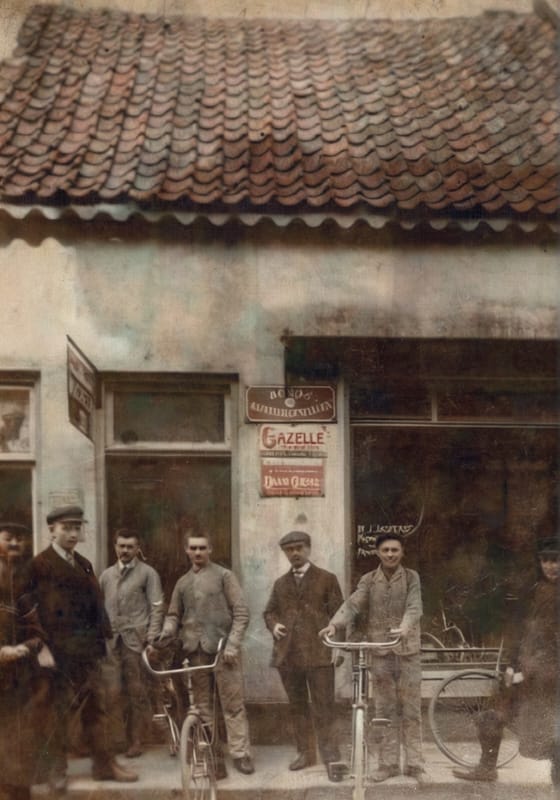 Foto: De fietsenzaak van Marinus Jasperse omstreeks 1900. Tweede van links Marinus Jasperse, rechts daarnaast met fiets zijn broers Willem en Johan