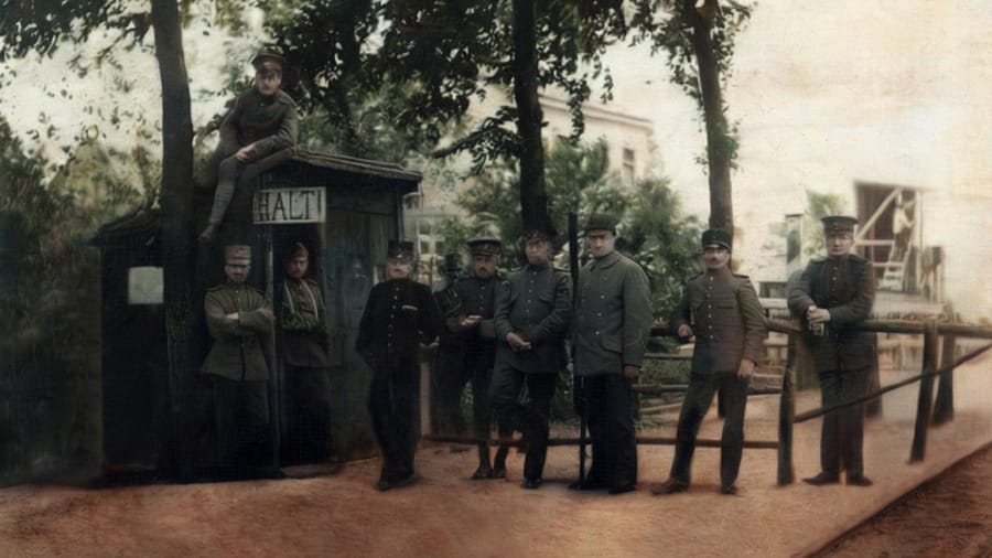 Foto: De grenswacht in 1914 met rechts duidelijk zichtbaar het spoor