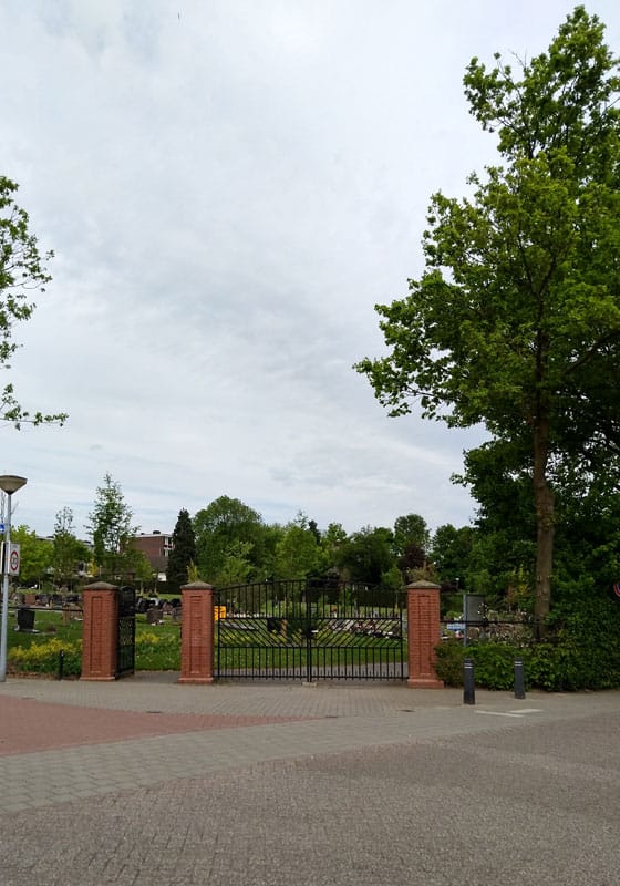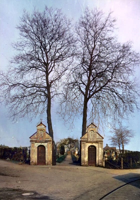 Foto: De ingang van het oude katholieke kerkhof, met aan weerszijden een lijkenhuisje