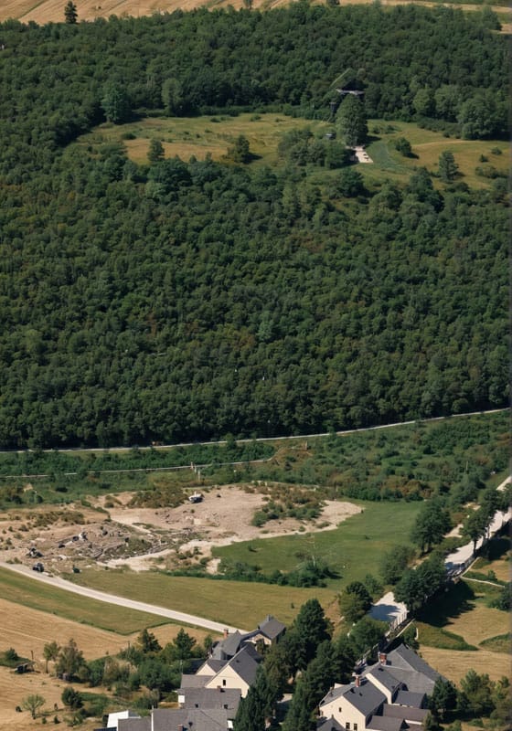 Foto: Luchtfoto uit 1927 van de Zwarte Kolkse weg, en de Zwarte Molen. Links onder aan de bosrand nog vaag zichtbaar het stenen lijkenhuisje